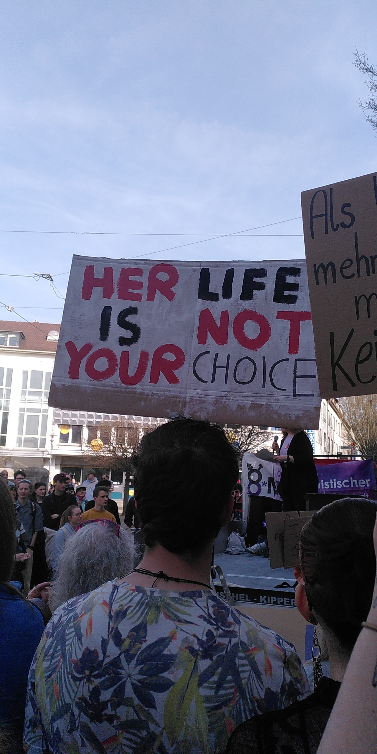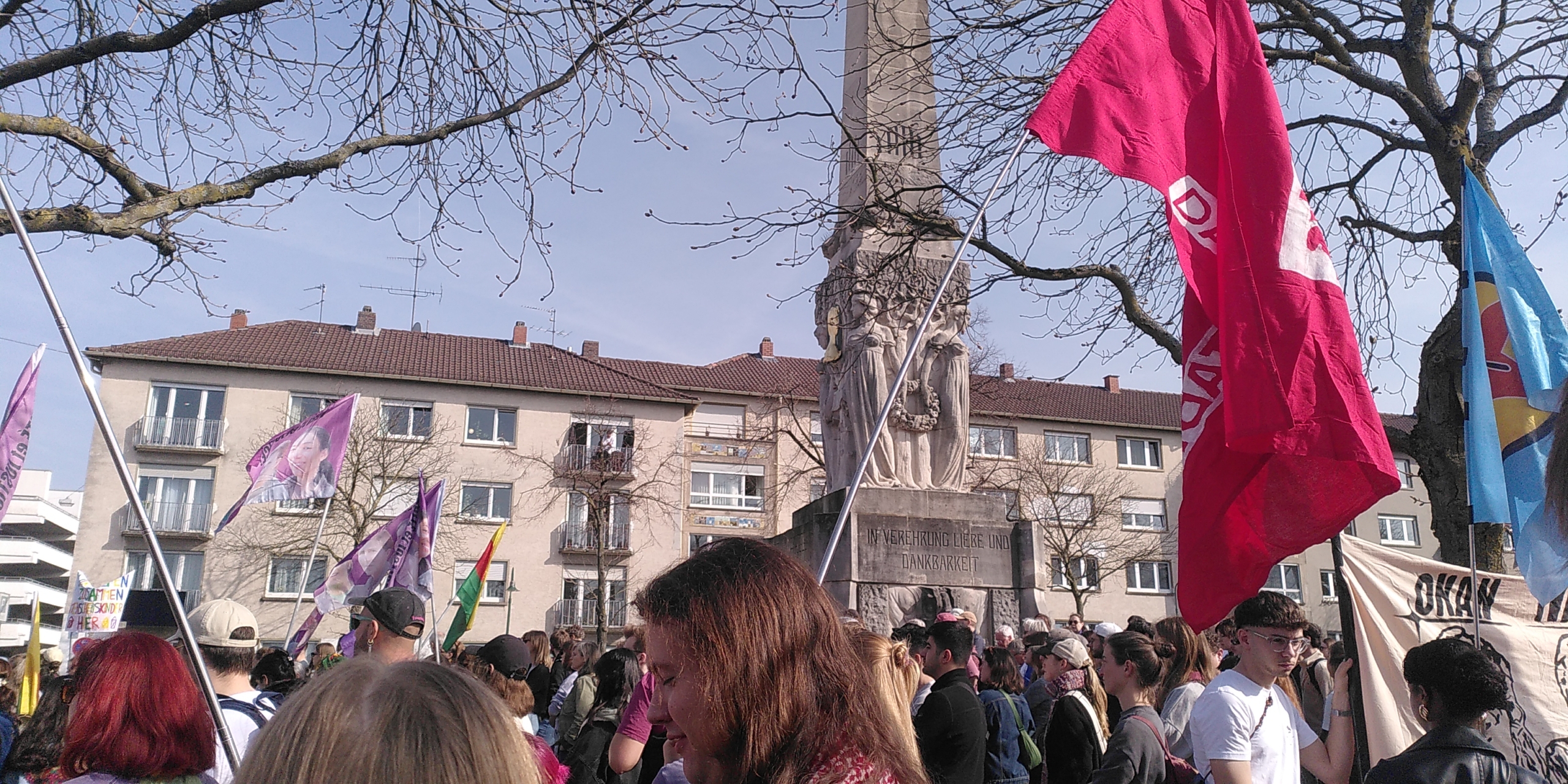 Heute haben wir bei strahlendem Sonnenschein mit vielen Menschen in Darmstadt für Gleichberechtigung und das schöne Leben gegen das Patriarchat demonstriert. Denn heute war feministischer Kampftag.